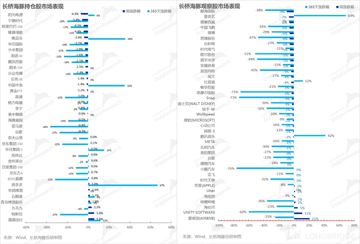 上周持仓股中以消费表现相对坚挺;而新能源、半导体板无论是组合的持仓票池还是观察票池都出现了不同程度的回撤。