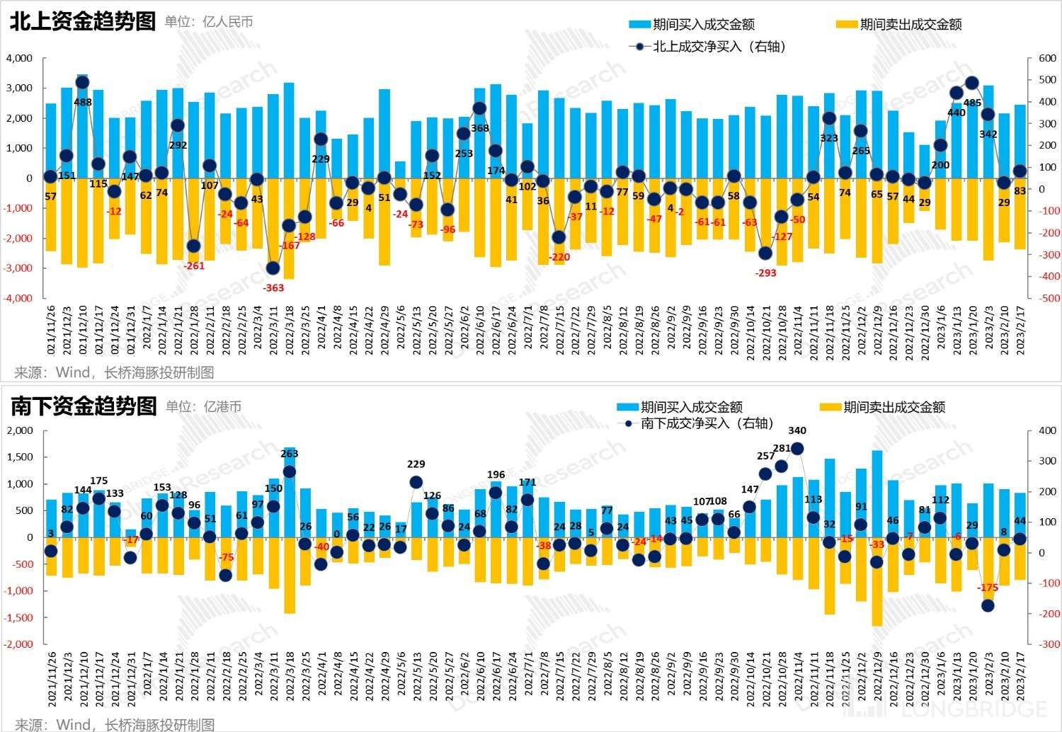在南北通上,因为美元强势,人民币边际走弱,北上和南下虽都在买入状态,但买入的绝对值和整体成交规模上都还相对偏弱。