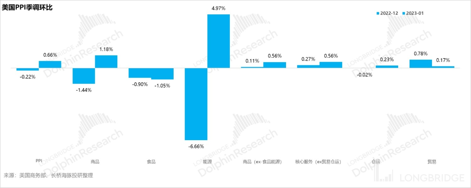 而且分项来看,除了商品中能源涨幅较大,即使剔食品、能源,核心商品环比涨价 0.56%,且剔贸易仓运的核心服务也是同样涨幅,整体生产物料端似乎又有通胀抬头的趋势。