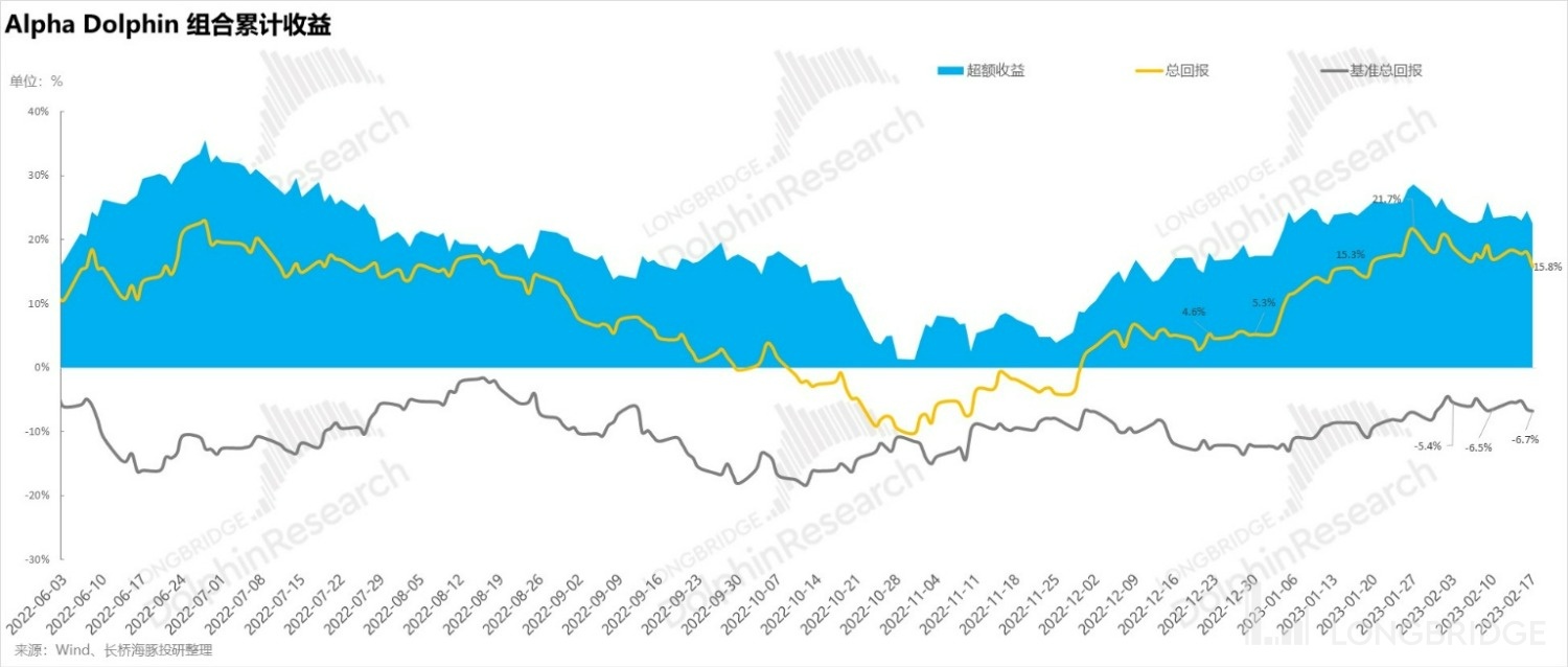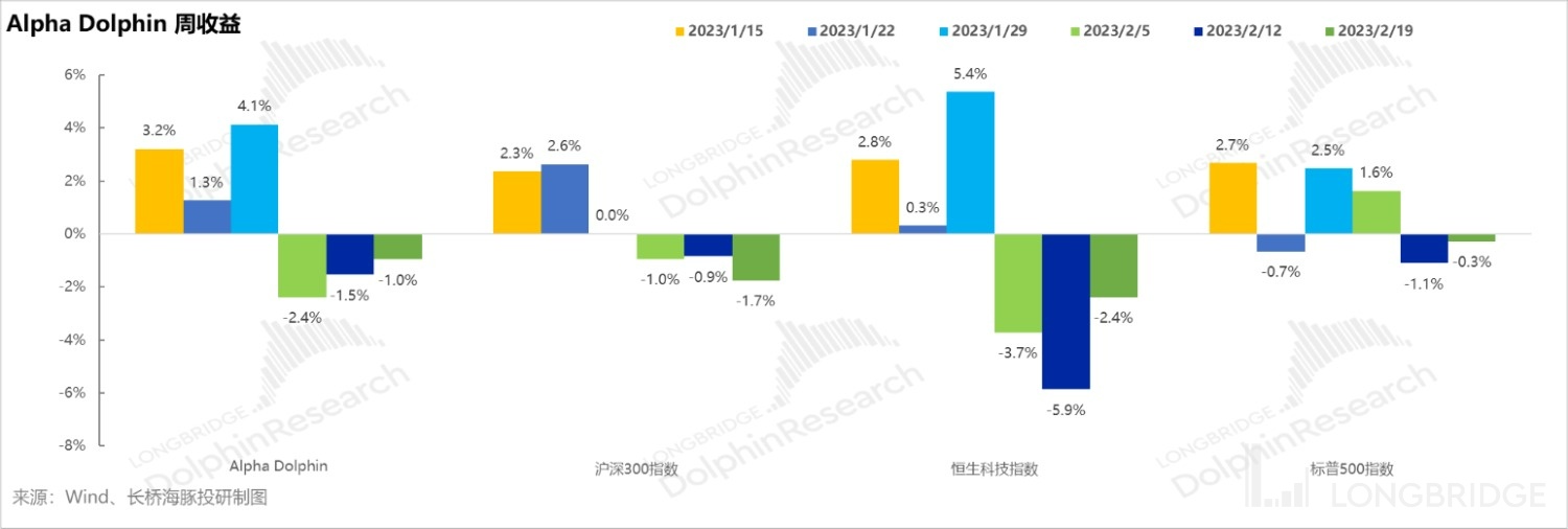 在 2 月 19 日这周内, Alpha Dolphin 组合下行 1%,由于组合中中国资产较多,小幅跑输标普 500(-0.3%),但明显跑赢沪深 300(-1.7%)及恒生科技(-2.4%)。
