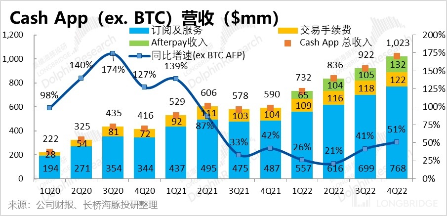 具体来看,以联名银行卡业务和即时提现业务 (至银行账户) 为主的订阅服务(剔除并表后)本季收入为 7.7 亿元,同比增长达到 53%,是推动 Cash App 变现增长的主要动力。