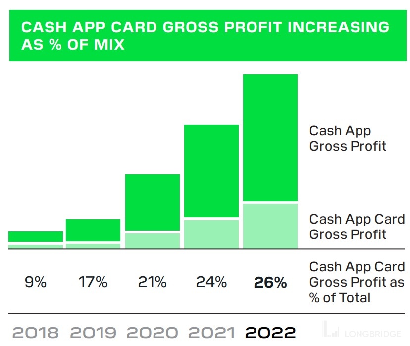 而根据本季的 Shareholder Letter,2022 全年 Cash App 联名银行卡(Cash App Card)贡献的毛利润达到了 7.5 亿美元,同比增加 56%,可以说是推动板块增长的主要动力,已贡献了 Cash App 板块整体中 26% 的毛利。