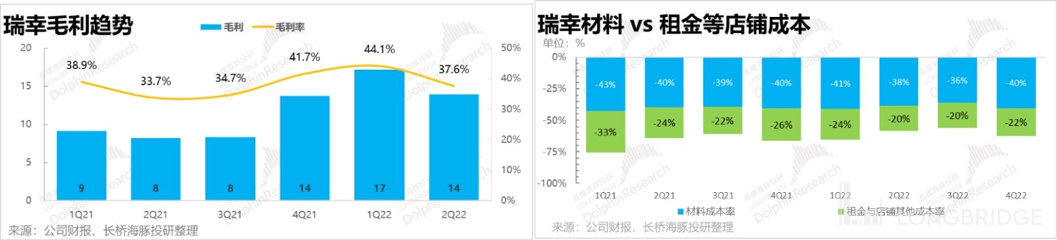四季度瑞幸毛利 14 亿,毛利率 38%;而从成本的两个维度——最大可变成本材料成本,和相对固定成本——店铺租金等来看的话,毛利率提升的关键只有一条——用同店销售额的增长 + 数字化工具等稀释租金、减少人力投入。