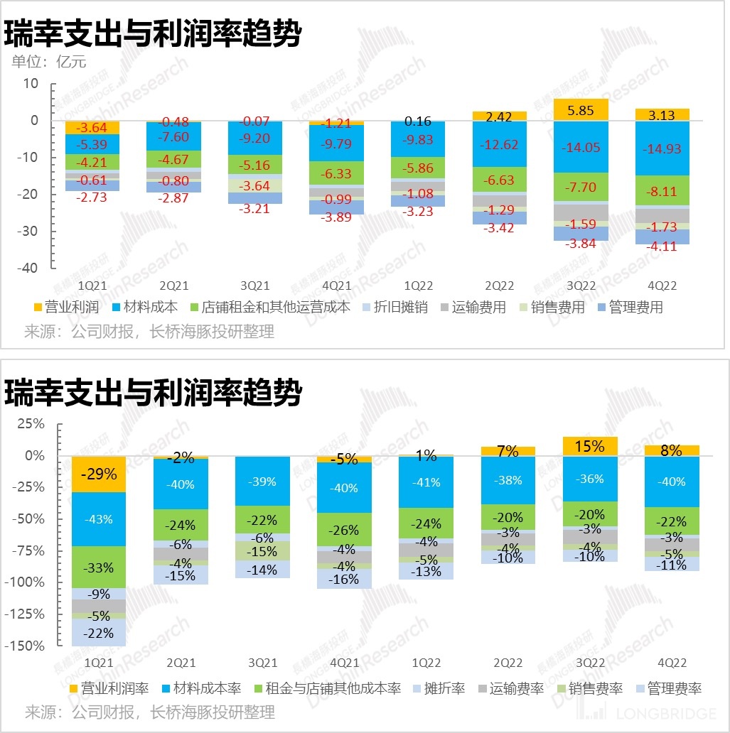 最终在关键的经营利润上,四季度瑞幸做到了 3 亿,极端环境下仍然为正,利润率 8%,比三季度下滑了 7 个百分点。