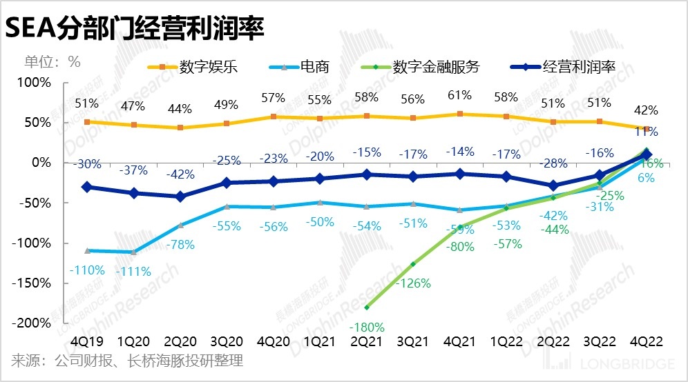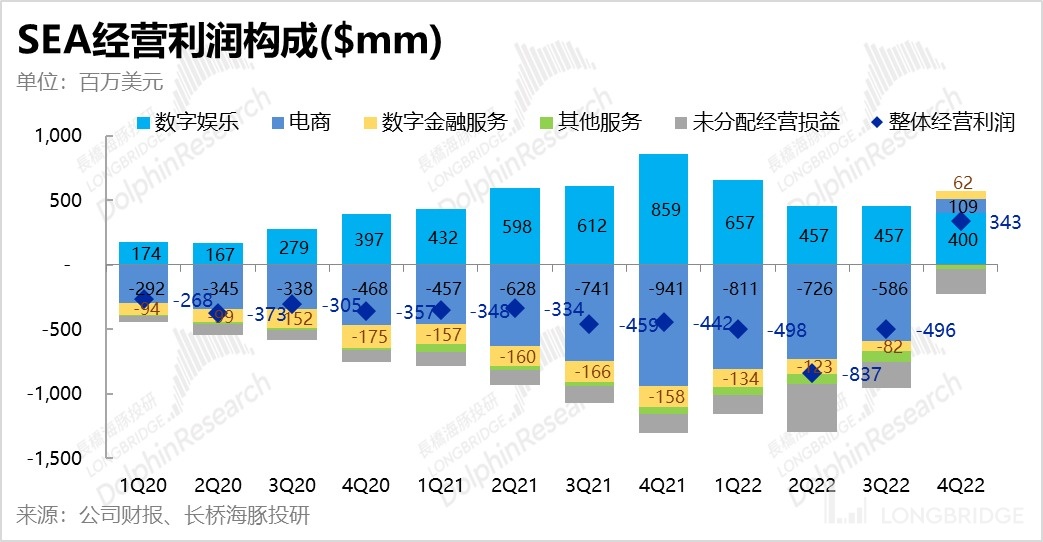 单看利润 SEA 本季的表现可谓优秀,集团整体经营利润直接扭亏为盈,达到 3.43 亿美元,远超市场预期 3.9 亿的经营亏损。结构上,游戏娱乐、电商和数字金融三大板块本季度全部实现了盈利,宣告三个板块都已可独立生存,具体来看,