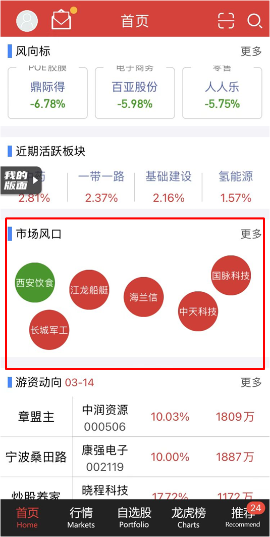首先我们打开 “开盘啦” APP 点击首页,打开下方的市场风口:
