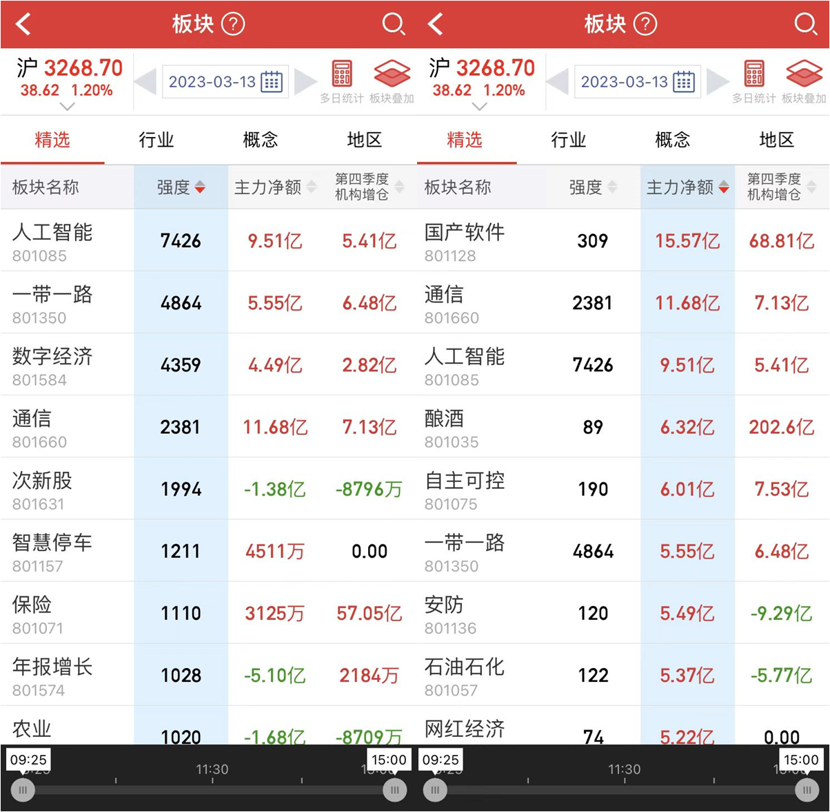 大盘在科技股的带动下震荡走强,上证指数收盘大涨 1.2%,这些科技类板块细分个股的资金均出现大涨,3 月 13 日收盘我们看看这些板块的情况,吓了我大一跳,最强的细分板块都是属于科技类的板块!可见市场风口非常暴力,帮助你辨别市场主流资金去哪里了。