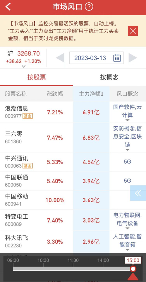 市场风口:市场风口是将两市 3000 多只股票,利用大数据监控市场交易最活跃的股票,由 3000 个减少到 30-50 个,大大提高了 60 倍的看盘效率。主力买入卖出用于统计主力的买卖金额,当资金异动满足一定条件后会自动上榜,并给出概念分类。通过市场风口,可以辨别出资金去哪里了。通过拖动时间轴把每个时间点上榜的个股进行分类,及时发现盘面重点个股。也就是说,你不需要看着 3000 个股票了,你精力更集中了,也知道牛市中心点在哪。大概率的捕抓一线游资的动向