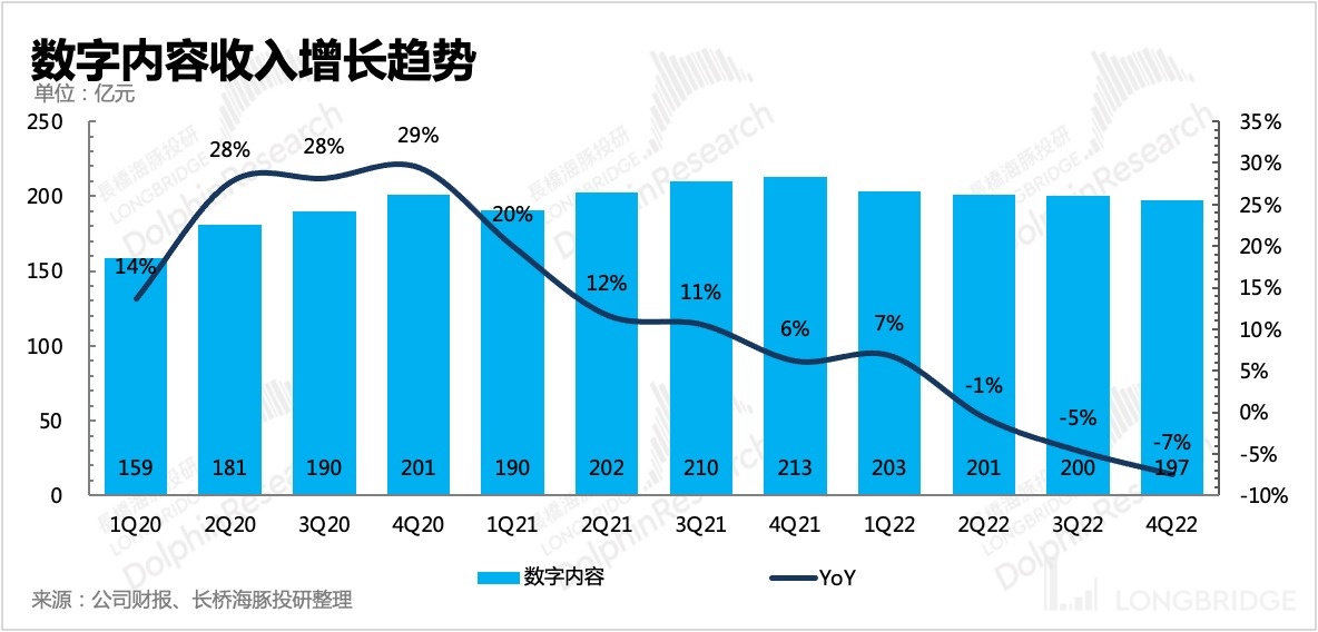 以音乐、网文、长视频订阅收入为主的数字内容业务,属于可选消费。宏观、竞争,对这部分业务带来的压力更大。因此,在集团开展的降本增效中,数字内容是重点对象,被要求自负盈亏,不再成为集团盈利的拖油瓶。