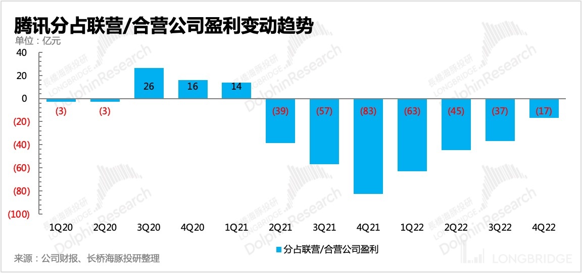 四季度其他收益净额因为处置投资公司收益显著增加而异常走高,主要是清仓式派发美团股份后(仅剩 1.7% 股权),美团由联营公司资产重新分类为公允价值计量的金融资产而确认的账面收益。此外,就是腾讯系的被投公司,都在做降本增效的经营调整,因此腾讯作为股东分占的亏损也在下降