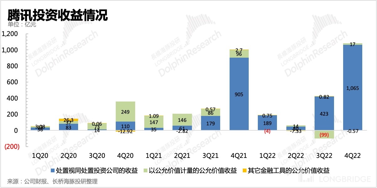 3、抛售美团带来账面上 1065 亿的投资收益确认:上季度宣布向股东派发美团股票,仅留可忽略不计的小仓位,属于变相清仓美团,这个季度将这部分投资收益在账面上进行了确认。去年 3 月发了京东礼包,今年又发美团大礼包,作为腾讯股东,这点福利还是不错的。