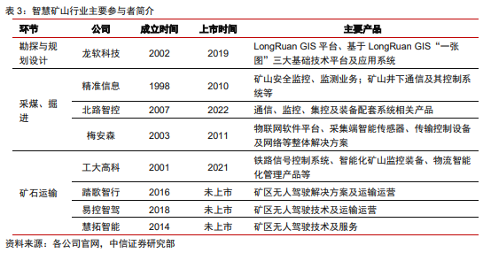 智慧矿山竞争相对充分,行业快速发展为产业链多方面带来机会。行业内企业数量众多,但普遍规模较小,具备自主研发能力并能提供完整解决方案的企业交少。在智慧矿山核心环节采煤、掘进领域,梅安森通过搭建物联网软件平台,提供多维度的安全监控系统,在安全监控等领域具有较强的品牌优势,并能够提供矿山智慧化的整体解决方案。在勘探设计领域,龙软科技以LongRuanGIS 为核心构建了智能矿山平台软件;采煤、掘进环节,北路智控提供通信、监控、集控等产品;矿石运输环节,以踏歌智行、易控智驾、慧拓智能为代表的一级市场公司在露天矿无人驾驶运输领域为主要参与方。