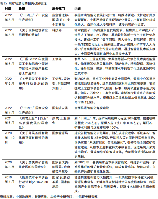 政策大力推进,助力煤矿智慧化发展。近些年,智能煤矿相关文件逐步完善,为煤矿智慧化的发展提供指导性方针,促进行业的智慧化、安全化、高效化的发展,煤矿智慧化发展被提上日程。2020 年,国家八部门联合印发《关于加快煤矿智能化发展的指导意见》,明确了煤矿智能化发展的目标、主要任务和保障措施,对采煤、掘进、运输、通风、供电、选煤等环节的智能化发展具有重要的指导意义,政策中明确将主要目标分为 3 个阶段: