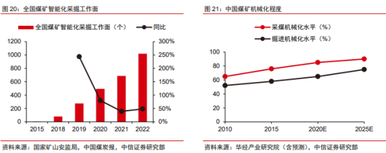 智慧化采掘工作面高速增长,推动煤矿机械化程度不断提升。受益于宏观政策的支持、行业技术的发展,煤矿智慧化采掘工作面增长保持高速增长。根据国家矿山安监局和中国煤炭报数据,全国煤矿智能化采掘工作面由2015 年的 3 个增长至 2022 年的 1019 个,7 年 CAGR 达 129.92%。相较于 2021 年 4500 处煤矿存量,煤矿智慧化采掘渗透率相对较低,发展程度依旧处于起步阶段。随着产业政策的不断推动、矿山信息化进程有望加速发展。此外,随着智能化、信息化、智慧化煤矿的建设,中国煤矿机械化程度料将不断提升,华经产业研究院预计至2025 年,采煤机械化水平将达到 90%,掘进机械化水平将达到 75%。