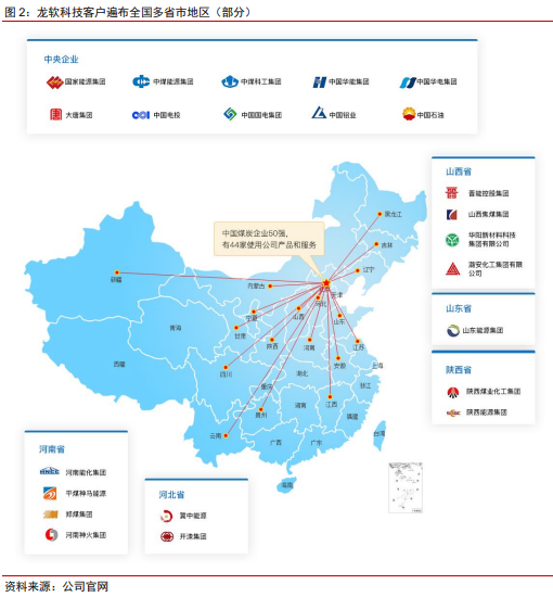聚焦煤炭行业头部客户,影响力辐射全国。在中国煤炭企业的50 强中,有 44 家使用龙软科技的产品和服务。从中央到地方,龙软科技的业务延伸至全国19 个省份的不同企业,如国家能源集团、中煤能源集团、中国石油、中国电投等;地方企业重点聚集在河南、山西、陕西等煤矿资源丰富的地区,为龙软科技构筑强有力的品牌影响力。