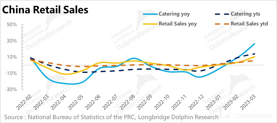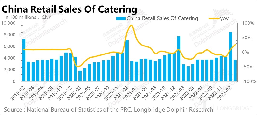 从行业近期的数据来看,啤酒单三月份的产量增速达到 20%,一季度累计产量增速也达到 5%。与此同时,整体社零的各个细分项目中,餐饮的修复情况也是最为显著。