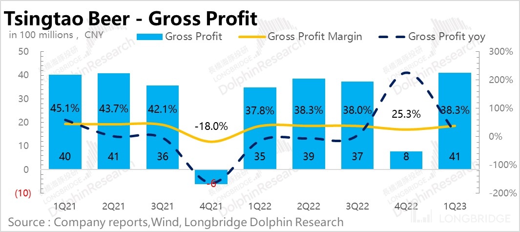如果是仅看毛销差的话,也有一定程度的向好,提升了 0.8pct,延续了去年四季度的趋势。海豚君比较看重的不是单季度的异常改善,而是持续的、循序渐进的向好,青岛啤酒目前显然已经走在了正轨上。