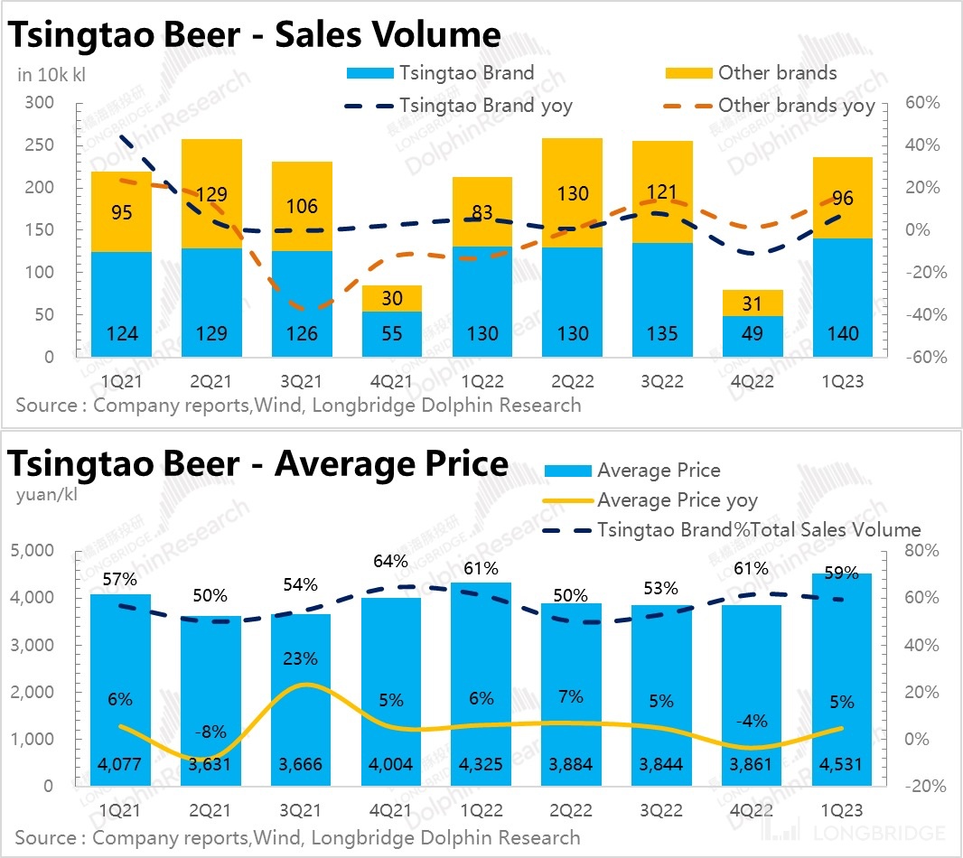一季度能取得较好的增长趋势,量价齐升,两者都功不可没。去年四季度单季度的销量出了一点小问题,没有延续到之前的增长趋势,好在今年一季度有调整过来。青岛主品牌和其他品牌在量方面具有较好的增长,不过美中不足的是青岛主品牌的增长稍微慢一下。