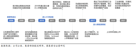 国内机器视觉领军企业,具备多产品线自主研发生产能力。奥普特2006 年成立,是国内较早进入机器视觉领域的企业之一,最早从光源和光源控制器产品起步,通过自主渐进式研发,已实现光源、光源控制器、镜头、相机、视觉控制器系统等机器视觉核心零部件全覆盖。2009 年,公司推出第一代 SciSmart 智能视觉软件,实现软件层面自研。2010 年公司通过富士康打入苹果供应链,并于 2016 年正式成为苹果直接供应商。2017 年,公司进入宁德时代和比亚迪等锂电池企业供应链,业务范围从 3C 电子扩大到新能源领域。2019 年,公司实现相机自主研发与销售,同时于 2021 年推出工业读码器和 3D 激光传感器并实现自主相机常用型号的覆盖。截至目前,奥普特的产品和解决方案已经应用于20 多个国家和地区,全球范围设立 30 多个服务网点,服务于 15000 余家客户。