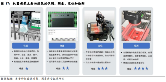 机器视觉具备识别、测量、定位、检测四大功能。1)识别:指甄别目标物体的物理特征,包括外形、颜色、字符、条码等常见的应用场景。2)测量:指把获取的图像像素信息标定成常用的度量衡单位,精确地计算出目标物体的几何尺寸,主要应用于高精度及复杂形态测量。3)定位:指获取目标物体的二维或三维的位置信息,进而辅助执行后续操作,常用于元件对位,辅助机器人完成装配、拾取等。4)检测:指对目标物体的表面状态进行检测,进而判断产品在生产制造状态中是否存在缺陷,内涵和种类繁多。机器视觉四大应用功能中,检测为最主要的应用。据中国机器视觉产业联盟统计,2020 年质量检验和表面纹理检查合计占比 49.8%。