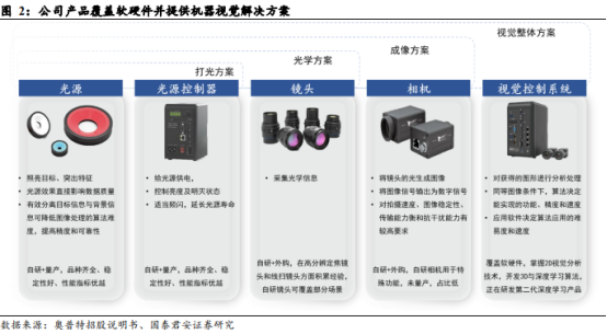 公司可为客户提供软硬一体的机器视觉解决方案。奥普特自主产品线已覆盖光源、光源控制器、镜头、工业相机、视觉系统等机器视觉核心软硬件产品,在工业读码器、3D 激光传感器及深度学习产品方面完成布局并取得了销售突破。同时,奥普特以产品核心技术为基础,建立了成像和视觉分析两大技术平台,结合多年积累的机器视觉在各下游行业应用的专有技术(Know-How),形成了多层次的技术体系。以此为基础,公司能够向下游客户提供各种机器视觉解决方案,协助客户在智能装备中实现视觉功能,提高机器视觉系统的准确性、稳定性和可靠性,从而带动公司产品的销售。