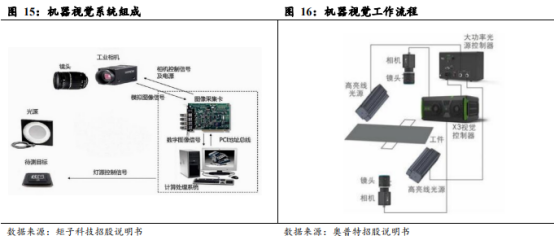 机器视觉系统由成像和处理两大部分构成。机器视觉设备是一种借助光学装置和非接触的传感器获得被检测物体的特征图像,并通过计算器从图像中提取信息,进行分析处理,进而实现检测和控制的装置。机器视觉技术涉及机械、电子、光学、自动控制、人工智能、计算机科学、图像处理和模式识别等诸多领域。机器视觉设备由两部分构成,一是视觉控制硬件,即“视” 的部分,负责成像功能,包括光源、镜头、工业相机、图像采集卡;二是视觉处理软件,即 “觉” 的部分,负责对成像结果进行处理分析、输出分析结果至智能设备的其他执行机构。