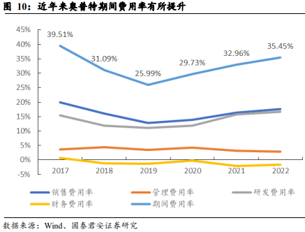 [[@pay@]] 高研发投入保持技术领先优势。2017-2022 年公司期间费用率由 39.51% 下降至 35.45%,拆分看研发费用与销售费用为期间费用主要组成部分。2022 年,公司研发费用达到 1.91 亿元,同比增长 39.32%,主要原因为研发人员增长、研发项目增多;销售费用达到2 亿元,同比增长 40.14%,主要原因为销售人员增加,销售人员薪酬、差旅费、业务招待费和样品增加;财务费用率与管理费用率保持较低水平,分别为-1.64% 与 2.82%。
