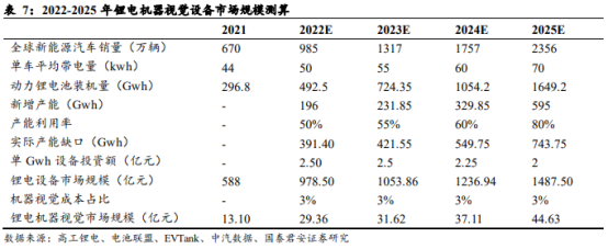 预计至2025 年锂电机器视觉系统市场规模将达到 44.63 亿元。根据高工锂电数据,2019-2021 年锂电机器视觉系统市场规模分别为 4.55/7.22/13.1 亿元,锂电设备市场规模分别为 229/287/588 亿元,对应机器视觉系统成本占比分别为 1.99%/2.52%/2.23%。随着锂电池自动化产线的提升、无人车间的投入,未来依靠机器视觉的完全在线检测将会替代目前的离线取样检测和半自动人工抽检方式,推动机器视觉产品在锂电池制造中的应用占比提升。因此假设未来机器视觉在锂电设备成本占比在 3%。根据《中国新能源汽车行业发展白皮书(2022 年)》数据,预期 2025 年新能源车全球年销量 2356 万辆,假设单车带电量略有提升,产能利用率也随新产能替代老产能的趋势提升,则到 2023/2024/2025 年动力电池实际产能缺口分别达 421/549/743GWh,对应 2023/2024/2025 年市场规模达到分别约 1053/1236/1487 亿元。若以机器视觉 3% 的成本占比估算,锂电机器视觉对应 2023/2024/2025 年市场规模约 31.62/37.11/44.63 亿元。
