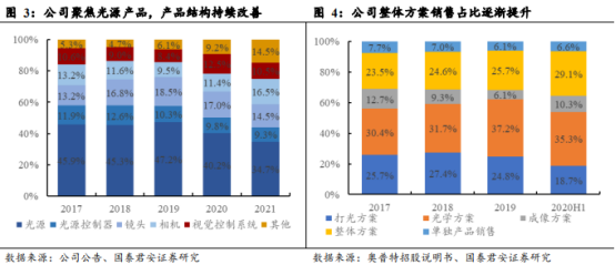 公司聚焦光源产品,产品结构持续改善。光源及其控制器构成打光方案,镜头构成光学方案,相机构成成像方案,光源+ 光源控制器 + 镜头 + 相机 + 视觉控制系统构成整体解决方案。2017-2021 年光源和光源控制器营收占比分别为 57.8%/57.8%/57.5%/50.0%/44.0%,贡献公司主要营收。近年来,随着自主镜头、相机及整体解决方案的推广,光源产品占比逐渐下降。得益于在 3C 和新能源两大领域大力推广软硬一体化解决方案,公司整体解决方案占比持续提升。2017-2020H1,公司整体解决方案营收占比分别为 23.5%/24.6%/25.7%/29.1%。