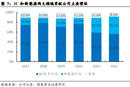 营收稳健增长,盈利能力保持较高水平。2017-2022 年,公司营业收入由 3.03 亿元增长至 11.41 亿元,CAGR 达 30.37%;归母净利润由0.76 亿元增长至 3.25 亿元,CAGR 达 33.73%;归母净利率 CAGR 高于营收 CAGR。2017-2022 年,公司毛利率始终维持在 65% 以上。2021 年,毛利率下滑主要系产品结构变动导致。2021 年,公司新能源业务营收同比增长 244.0%,3C 电子营收同比增长 4.4%,3C 电子业务毛利率显著高于新能源业务。2022 年,新能源业务增速虽然超过 3C,但在规模效应拉动下,毛利率保持相对稳定。因为销售费用和研发费用的大幅增长,2022 年净利率较 2021 年下滑幅度较大。