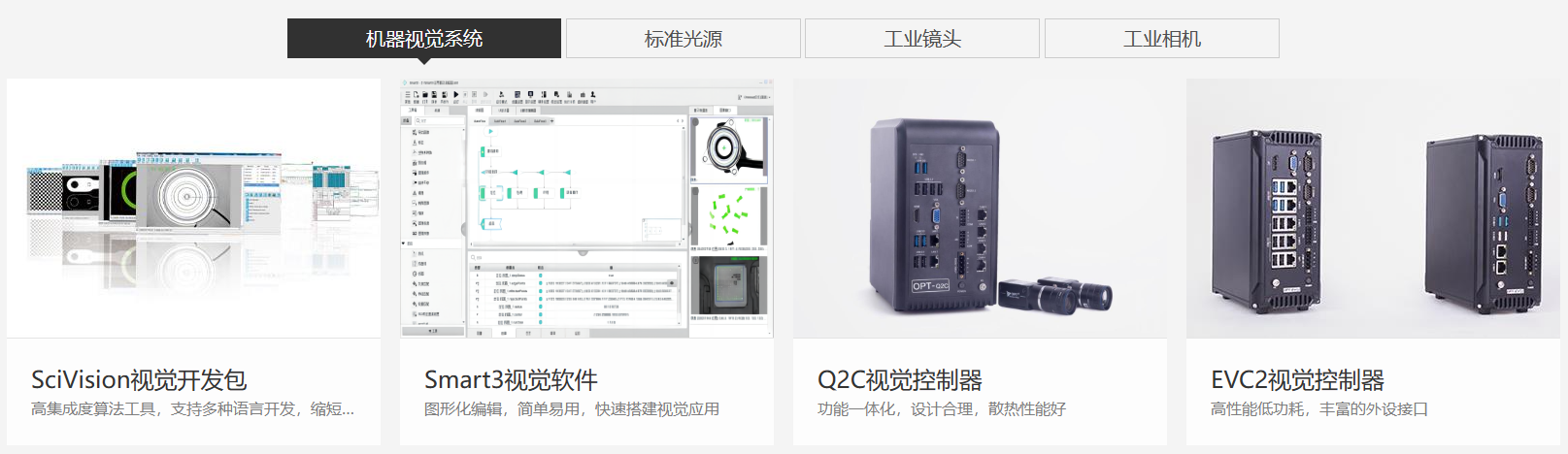 (5)视觉控制系统:对图像信息进行数字运算和处理,根据预设条件进行分析判断,并将结果信号传输至相应硬件进行执行。公司产品包含视觉分析器和视觉分析软件,其中视觉分析软件产品包括SciVision 视觉开发包和 SciSmart 智能视觉软件。