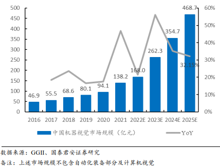 2025 年中国机器视觉市场有望达到 468.7 亿元。根据GGII 数据,2016-2021 年我国机器视觉市场规模由 46.9 亿元增至 138.2 亿元,CAGR 为 24.1%。中国制造业的快速成长,以及自动化、智能化水平的进步,为我国机器世界行业的发展提供了深厚土壤。根据 GGII 数据,预计至 2025 年,我国机器视觉市场规模有望达到 468.7 亿元,2022-2025 年 CAGR 为 40.78%。