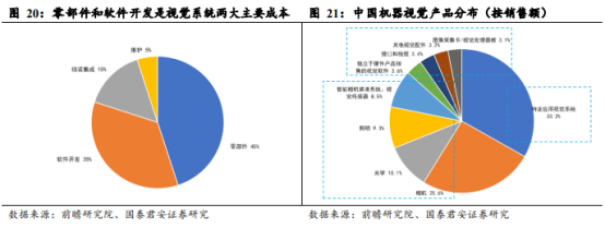 零部件和软件合计占机器视觉系统成本的80%;中游产品以视觉系统和相机为主。从机器视觉系统成本构成来看,零部件、软件开发、组装集成、维护分别占45%/35%/15%/5%;其中零部件和软件开发两项合计达 80%。从机器视觉销售额上看,视觉系统/相机/光学/照明/智能相机&传感器分别占比 33.2%/25.6%/10.1%/9.3%/8.5%,视觉系统和相机是机器视觉最大的两项细分销售领域。