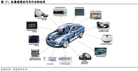 汽车制造成为工业机器视觉应用重要增长点。汽车制造过程复杂且程序繁多,在汽车生产过程中使用机器视觉技术来代替人工进行检测,不仅能够提高工作效率及准确率,还可以降低生产成本,因此机器视觉技术被广泛应用于汽车制造业,主要应用包括汽车零配件检测、汽车装配校验检测、汽车零配件二维码及字符识别、涂胶检测等。此外,目前国内积极推动网联汽车发展,汽车电子化趋势将进一步加强。过去汽车以机械结构为主,在新能源和智能汽车中,电子零部件的成本占比将会达到整车的一半以上,大量的雷达(激光、厘米波、毫米波、超声波)、传感器、通信(GPS、DSRC、4G/5G)、摄像头、监控、检测、娱乐系统将会被装载在汽车之上,汽车行业对采用机器视觉技术检测设备以及智能制造装备的需求量将不断提高。