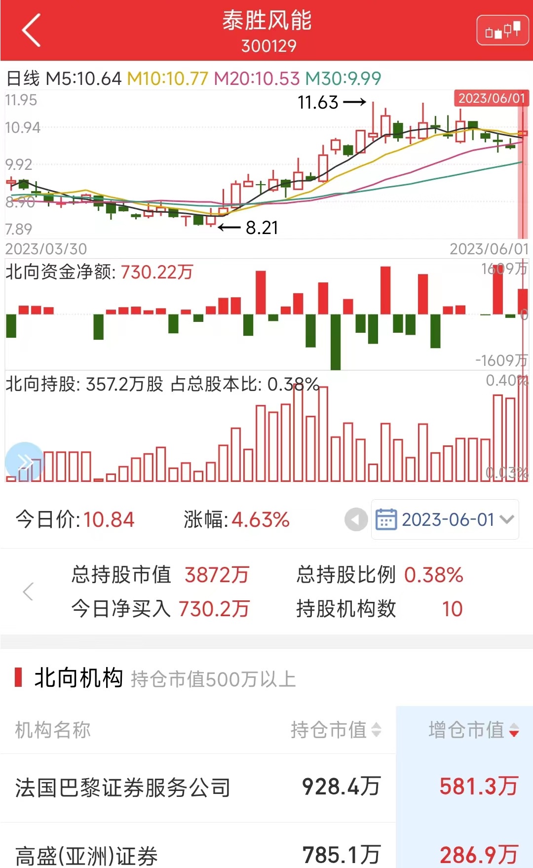 1、泰胜风能:风电发展势头迅猛,北向资金蠢蠢欲动。