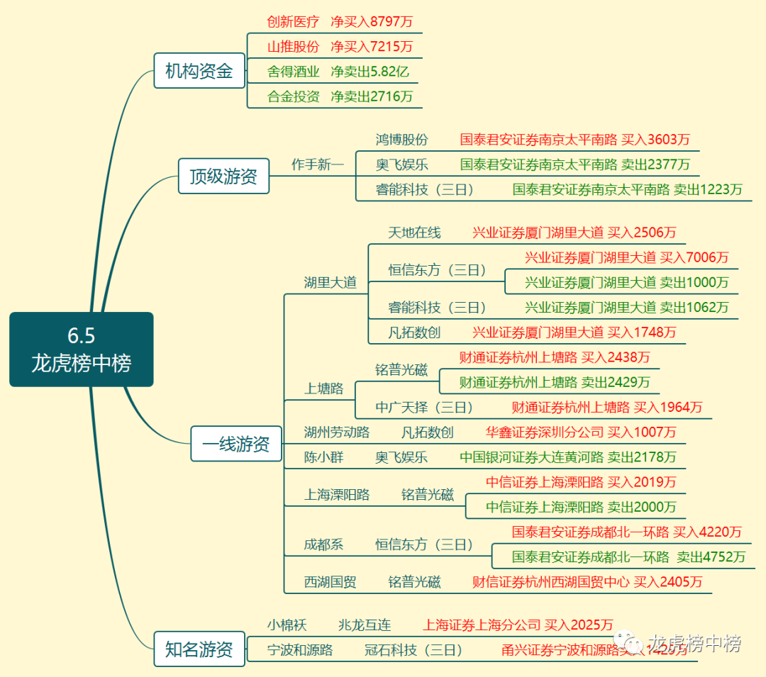 机构买入创新医疗、山推股份,卖出舍得酒业、合金投资;作手新一买入鸿博股份,卖出奥飞娱乐、睿能科技(三日);湖里大道买入天地在线、凡拓数创、做 t恒信东方(三日),卖出睿能科技(三日);上塘路买入中广天择(三日),铭普光磁;湖州劳动路买入凡拓数创;陈小群卖出奥飞娱乐;上海溧阳路做 t铭普光磁;西湖国贸买入铭普光磁;成都系做 t恒信东方(三日);日内轮动高点,留意能否继续共振走强。