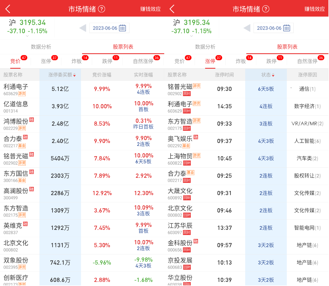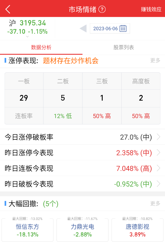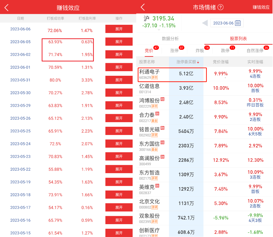 下面我们再来回顾下 6 月 6 日市场情绪选择赚钱效应进行比较:
