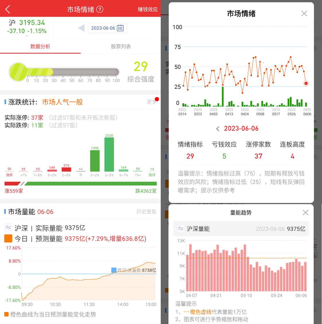 市场情绪:主要分为股票列表、数据分析、赚钱效应三大功能。