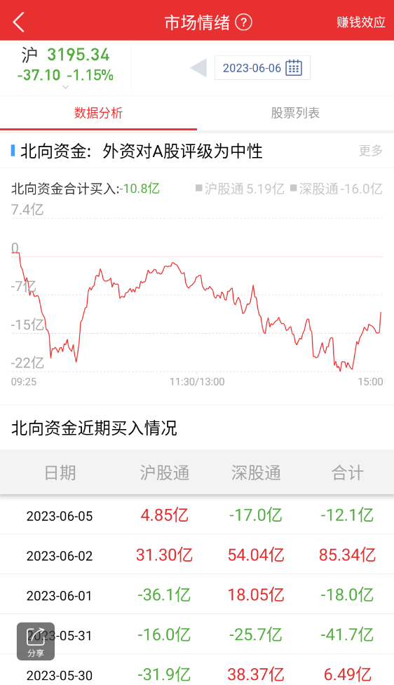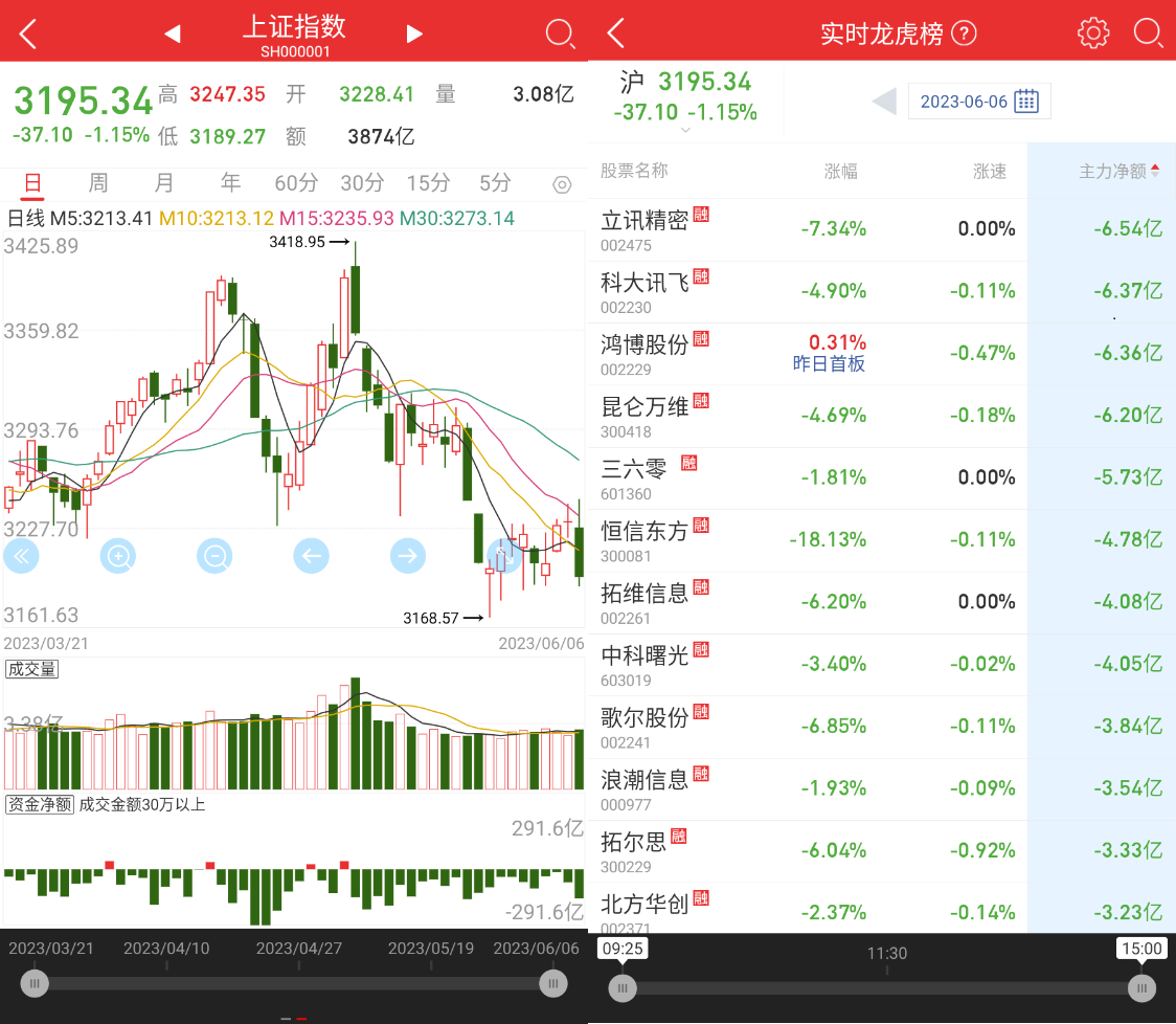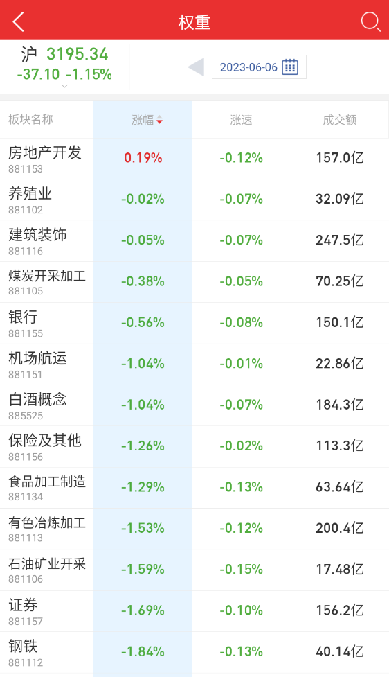 从 6 月 6 日上证指数走势来看,大盘全天震荡走低,三大指数均跌超 1%,沪指再度失守 3200 点,创业板指领跌续创年内新低;近期房地产相关政策呼吁明显,盘面上,房地产产业链个股再度活跃,金科股份、京投发展、沙河股份等涨停。隔夜三大运营商联合发布了《电信运营商液冷技术白皮书》。液冷概念股开盘大涨,英特科技20CM 涨停,英维克、佳力图涨停。苹果 MR 发布在预期内,概念股集体大跌,清越科技20CM 跌停,长盈精密跌超 19%。杭州热电被监管通报,带崩整体电力板块,杭州热电、南网能源跌停。全市场今日成交额 9375 亿,较上个交易日放量 637 亿。截至收盘沪指跌 1.15% 报收 3195 点。北向资金全天净卖出 10.77 亿元,其中沪股通净买入 5.19 亿元,深股通净卖出 15.96 亿元。
