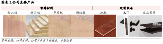 公司主营业务分为装饰材料和定制家具两大板块:装饰材料产品包括家具板材、基础板材、石膏板等主材产品以及科技木皮、装饰纸、五金、胶粘剂等辅料;定制家具业务是板材业务的延伸,产品包括衣柜、地板、木门等成品家具,公司主营业务在营收中的占比稳定在98% 以上。