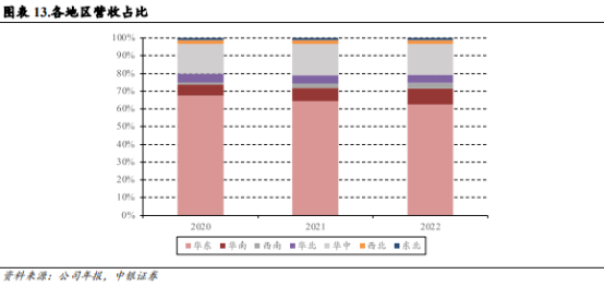 业务以内销为主,华东地区为核心市场:公司2020-2022 年内销占比超 90%,国内外销售毛利率情况总体相近,大陆地区毛利率相对更稳定。从 2022 年国内业务分地区情况来看,华东地区占比超 60%,华中地区占比 17%,位列第二。自 2016 年始,公司坚持 “华东领军、中西崛起、乡镇爆发” 的网络建设原则,立足华东区域,打造区域性优势品牌,快速推进全国网络渠道布局。