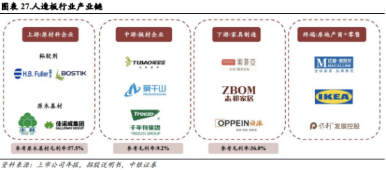 人造板产业链由原材料、板材、家具制造、销售四部分组成:人造板产业上游主要由板材原料原木和化工材料粘胶剂厂商构成。原木基材毛利率较高,丰林集团2020-2022 年林木业务平均毛利率为 57.5%,主要系我国林木资源紧缺,且行业存在政策制度壁垒以及经营管理壁垒。中游板材企业负责板材的制造和销售,公司与云峰新材、千年舟共三家板材业务 2020-2022 年平均毛利率为 9.2%。产业链下游包括家具制造、建筑装饰等行业,参考毛利率为 36.0%。人造板终端消费者为 B 端的房地产商、家居卖场以及 C 端零售。