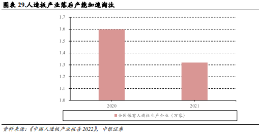 我国人造板行业落后产能加速淘汰,产业结构持续优化。据《中国人造板产业报告2022》,2021 年底全国保有人造板生产企业 1.3 万余家,较 2020 年减少了约 3,000 家;大型生产企业及集团近 190 家,合计年生产能力占总生产能力的 18.1%;年生产能力超过 100 万立方米的企业数量由 2020 年的 6 家上升至 9 家,行业集中度提升趋势明显。