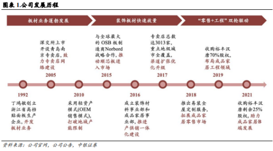 德华兔宝宝装饰新材股份有限公司创建于1992 年,前身是浙江省装饰贴面板生产企业。公司是国内高端环保家具板材产销规模最大的企业之一,2005 年在深交所上市。公司的发展大致可以分为三个阶段:第一阶段为 “板材业务发展期”,公司致力于专卖店建设和渠道建设,2010 年首次采用轻资产模式(OEM 销售模式),灵活布局地域产能;第二阶段为 “装饰板材放量期”,2015 年公司与加拿大顺芯板制造商 Norbord 的合作开启 “顺芯板” 时代,营收与净利润快速增长;第三阶段为 “零售 + 工程双轮驱动期”,公司产业链向下延伸,2018 年推出易装全屋定制,提供从板材到柜体的一体化定制服务,2019 年收购裕丰汉唐,进入房地产精装修工程领域。