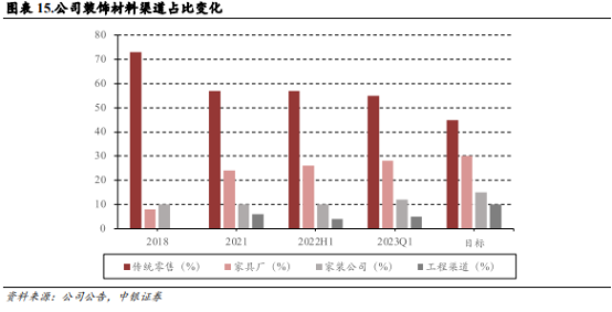 公司目前销售渠道以C 端和小 B 端为主:根据公司公告,拆分测算得到公司渠道收入占比如下:2022H1 公司装饰材料业务传统零售分销占 57%,小 B 端中家装公司占比 11%、家具厂占 26%、工程业务占 4%;定制家具业务中传统零售占 36%,开发商占 63%。C 端、小 B 端、B 端合计占比分别为 52%、28%、17%。至 2023Q1,公司各小 B 渠道占比进一步提升。公司中长期渠道占比目标中,零售分销业务占比将会占约 45%,家具厂 30%,家装公司 15%,工程渠道 10%。