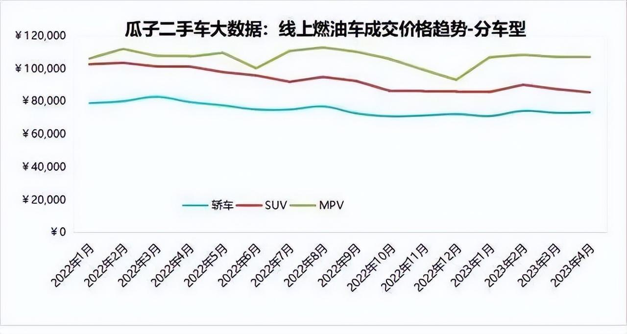 分车型看,受此最大影响的是 SUV 类燃油二手车,其 4 月份成交均价约 8.5 万,环比 3 月下跌近 2000 元,创 15 个月以来价格新低,而新能源二手车的成交均价却在逆势上涨,与去年 12 月份持平。