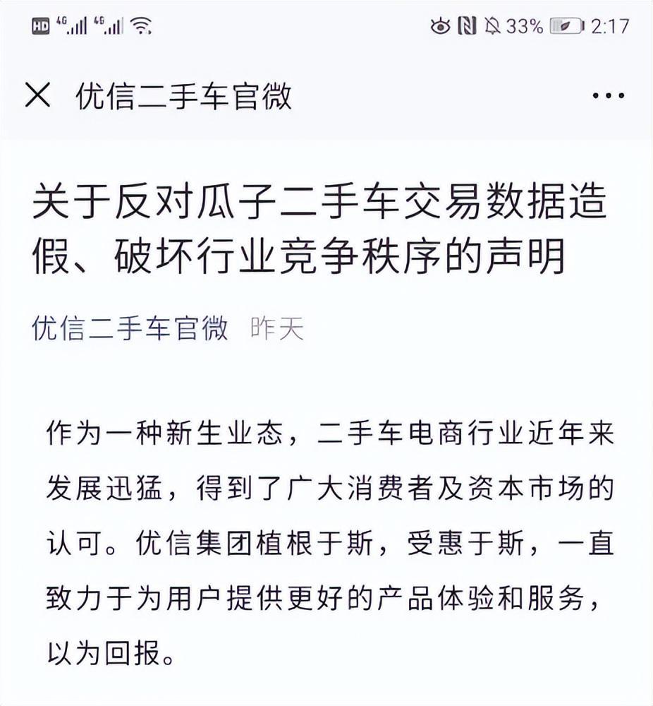 在国内二手车市场较为集中的情况下,优信还曾 “死磕” 瓜子,不仅列举了瓜子的 “三宗罪”,还指瓜子二手车的交易数据造假,破坏行业竞争秩序,虚增收入。