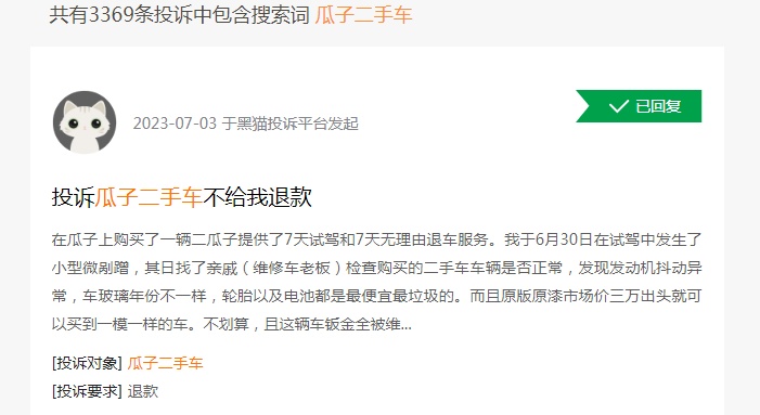 另外,看似瓜子不用再为收来的车型、品质兜底,只要过了 7 天便是买家和第三方之间的纠纷,但实际上在消费者眼里,这是平台纵容和不负责任的结果,黑猫投诉上,关于瓜子二手车的投诉多达3369 条。