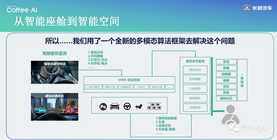 感知大模型:首先通过多模感知(包含 DMS 检测眼睑开合度,同时加入车辆动力学参数、车机交互输入、用户语音输入等)一同评估驾驶者的驾驶状态,然后进行任务输出(包括疲劳监测任务、心情预测任务、用户行为任务等),最终为其进行交互行为推荐、生态内容推荐等。