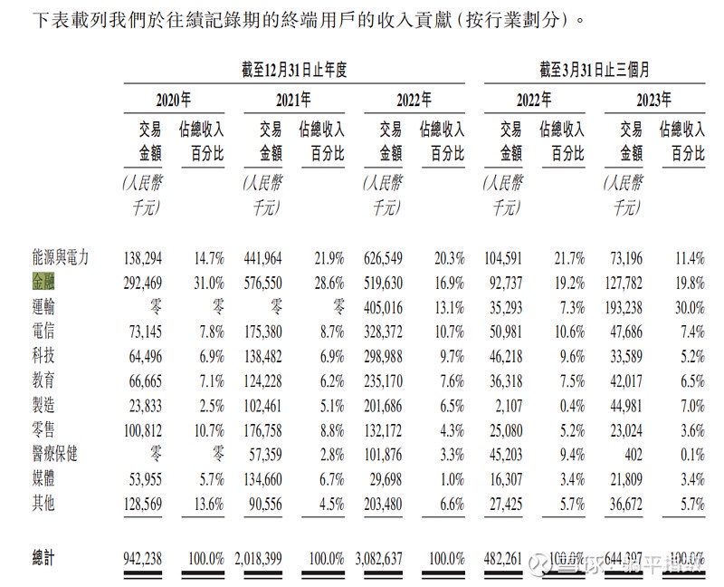 今年一季度,第四范式的收入增速为 33.6%,由于公司没有披露去年一季度的增速,我们无从进行同期对比;但从往年的收入增速来看,已经下滑了太多。造成这种情况的原因也很简单,先来看第四范式的客户行业分布情况: